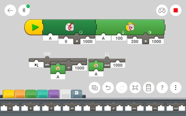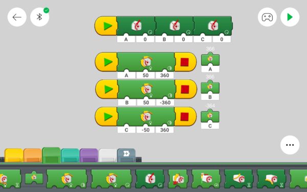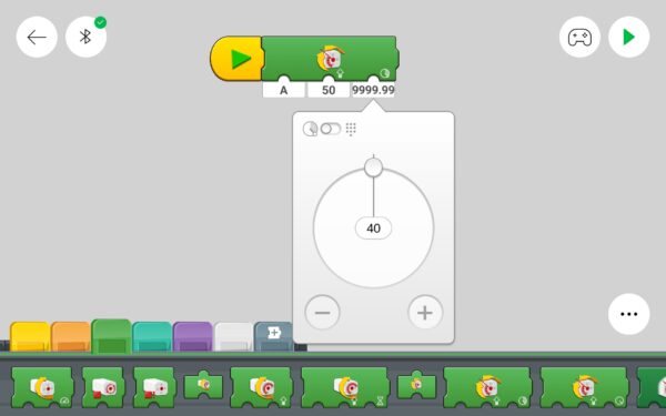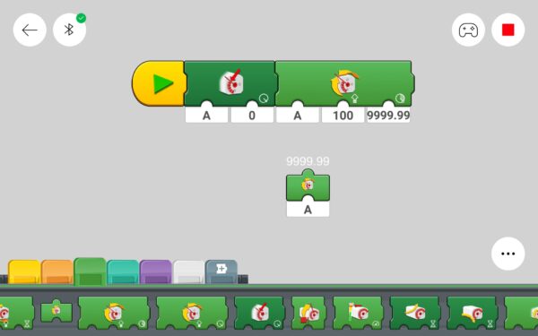 The next annoying thing is that the programming blocks’ input fields don’t let you type in anything above 9999. That would be likely a non-issue, but the positioning blocks (i.e. “motor A, please turn to this-or-that position”) take only degrees as an input. You can’t specify “two turns”, you have to put in “720 degrees” in. While it sounds like much, 9999° is only just shy of 28 turns, not much if you have any sort of gearing and, say, a crane or a lift application.