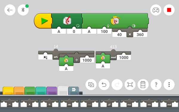 As you can see, the motor position sensor will also report the proper value way beyond 9999.99 degrees, you just can’t see it directly – but you can feed it through math blocks and it will process properly. In the picture above I work around the four-digit display input by calculating the number of thousands as round_down(position/1000) and separately get the remaining digits by taking (position mod 1000). So in the image above the actual position is 14413 degrees or 40.04 turns.