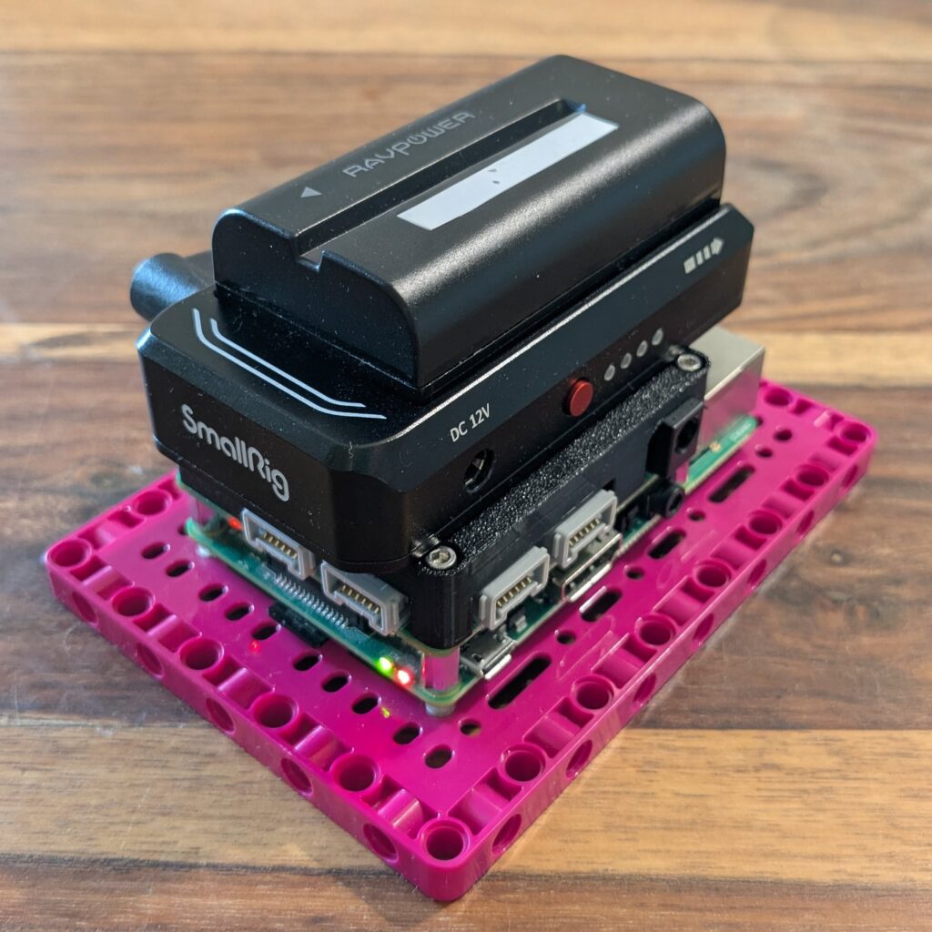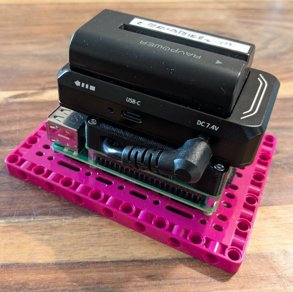 Here is an example of how I power a Raspberry Pi including a ‘Pi Build Hat’ (= an adapter board for connecting LEGO LPF2 components) from an NP-F battery (I used AI to remove the sticker with my contact details, which is why it looks strange):