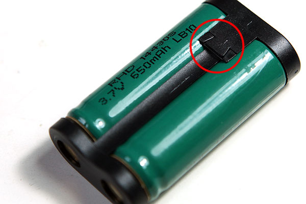 Genaue Analyse der Bauform des Original-Akkus (die Bilder im Internet sind nicht immer so klar, wie man es sich wünschte) zeigt nur einen Unterschied zu CR-V3: eine kleine Nase an der Unterseite. Diese Nase legt einen Schalter (SW101, Serviceanleitung Seite 32) im Batteriefach um. Nein, der dient nicht der Erkennung des Akkus, das Signal geht nicht mal an die CPU! Der schaltet nur die Ladekontakte auf der Hinterseite frei (über Q114/Q115), so dass der Akku in der Original-Ladeschale geladen werden kann (sonst würde die Gefahr bestehen, Mignon-Zellen aus Versehen zu laden).